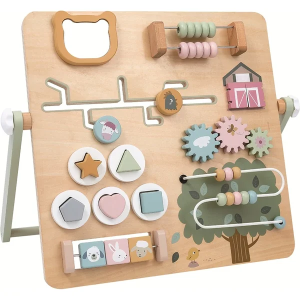 Découvrez le monde varié de la ferme à travers un tableau d’activités original rempli d’activités qui non seulement divertit les enfants, mais développe également leurs compétences motrices, leur concentration et leur pensée logique. Le tableau de jeu en bois offre une large gamme d’éléments interactifs, tels que des roues dentées rotatives, un labyrinthe à billes et des formes à insérer, et motive les enfants à explorer, apprendre et jouer. La finition colorée, l’agencement clair et la qualité de fabrication font de ce jouet un outil éducatif idéal pour les petits explorateurs à la maison et à la maternelle. Le tableau d’activités est équipé d’un support stable pratique.