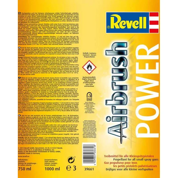 Air comprimé pour petits pistolets de pulvérisation. Destiné à la modélisation. Fermez le réservoir d’air comprimé avec un régulateur même si vous ne l’utilisez que pour une courte période. Après utilisation, dévissez le régulateur du réservoir. L’air comprimé Revell est particulièrement adapté à une utilisation avec le régulateur Revell (type 38360). Si vous utilisez d’autres systèmes, il est important d’utiliser des régulateurs compatibles. L’air comprimé Revell peut être utilisé avec tous les types de peintures et de liquides et de manière universelle pour l’application par pulvérisation. Il est très important de bien ventiler l’espace de travail.
