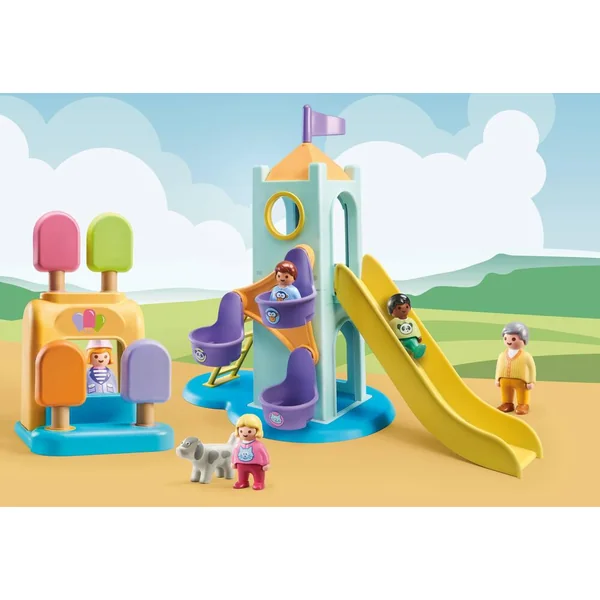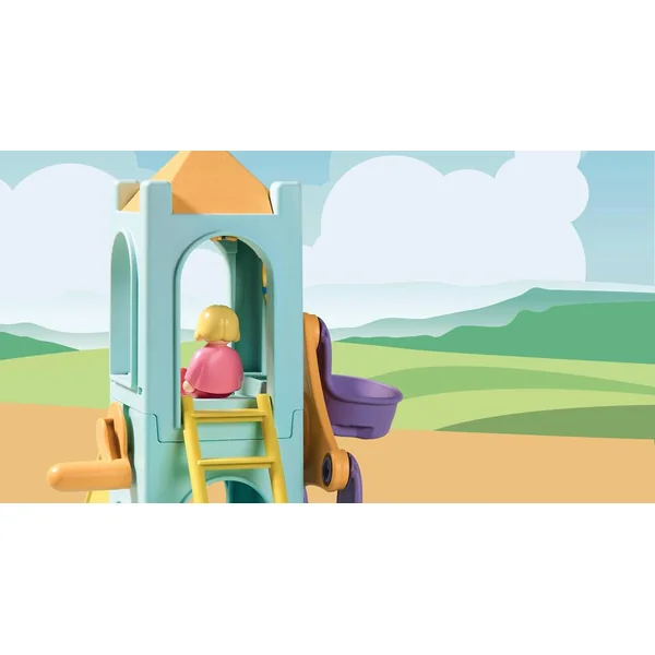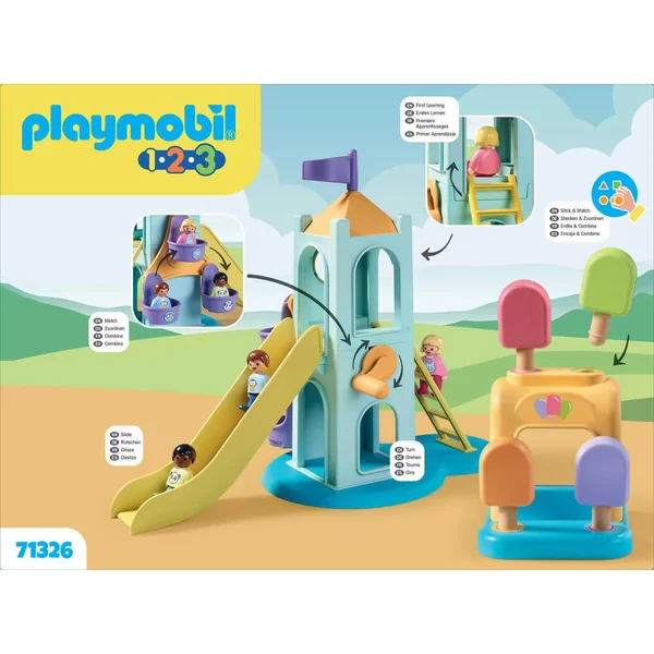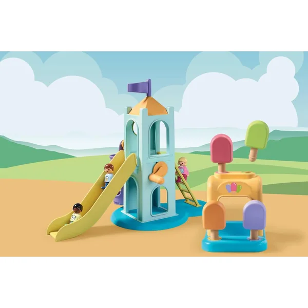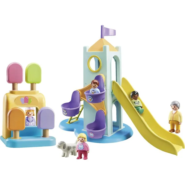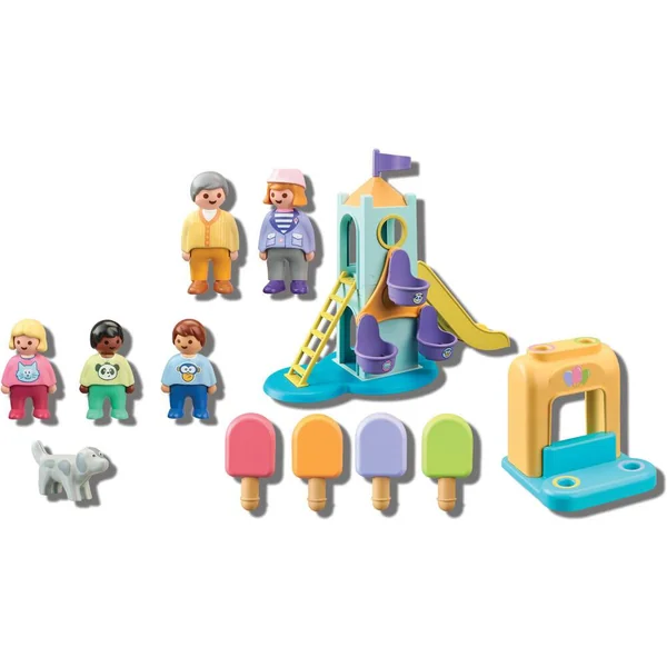 Contient 5 personnages, un chien et un stand de glaces avec 4 différents parfums. Les personnages peuvent grimper la tour et redescendre par le toboggan. L’aire de jeu dispose d’un toboggan La grande roue disposée sur le côté de la structure peut être activée à l’aide de la manivelle – Les personnages peuvent glisser le long de la rampe du toboggan -Un glacier avec différents parfums est vendu avec le set – Le set contient cinq personnages différents – Sur l’aire de jeux 1.2.3., il est impossible de s’ennuyer ! La structure de jeux qui rappelle la forme d’un château médiéval est une invitation à l’imagination et stimule la création des plus belles histoires. Pour accéder au toboggan, les personnages escaladent la structure au moyen de l’échelle disposée sur l’une des faces du château. Et pour ceux qui préfèrent faire de la grande roue, aucun souci puisque la structure dispose également de ce type de jeu. La manivelle permet notamment d’activer la grande roue. Et en cas d’une petite faim, le marchand de glaces est idéalement placé à proximité. Le stand offre un jeu de formes pour insérer les bâtonnets de glace. C’est aussi l’occasion pour les enfants de nommer les couleurs ou d’associer le nom d’un parfum. 18 Pièces.