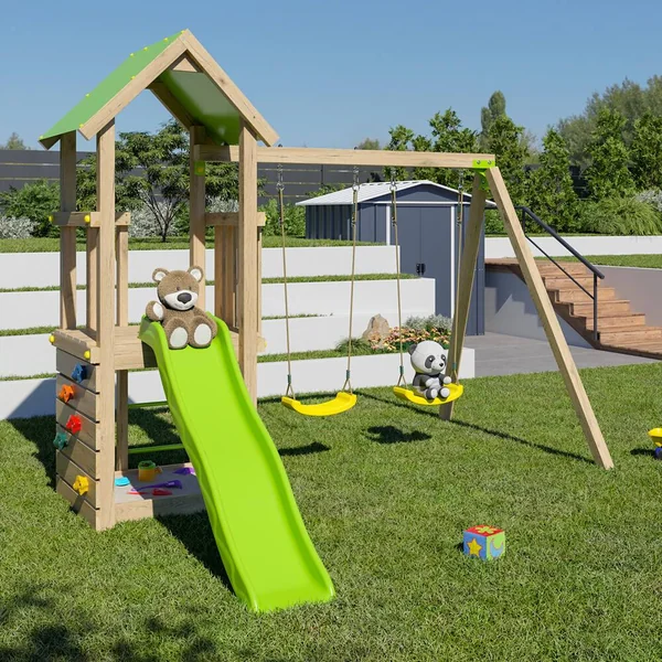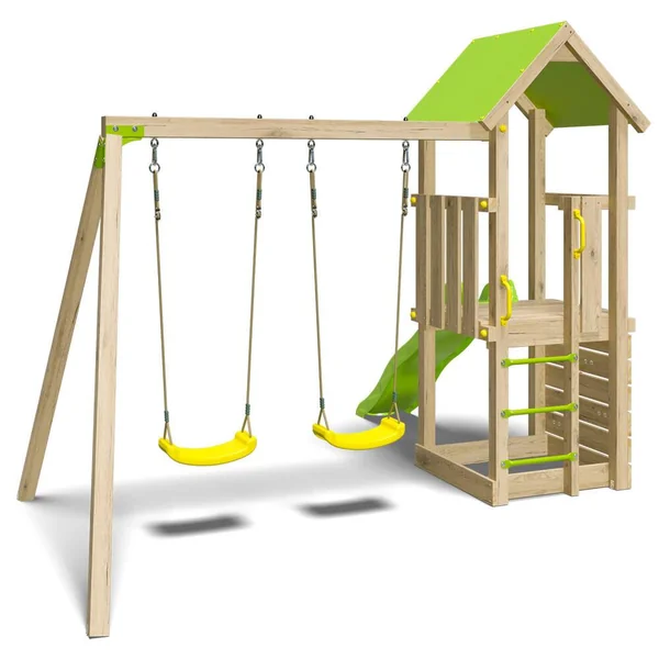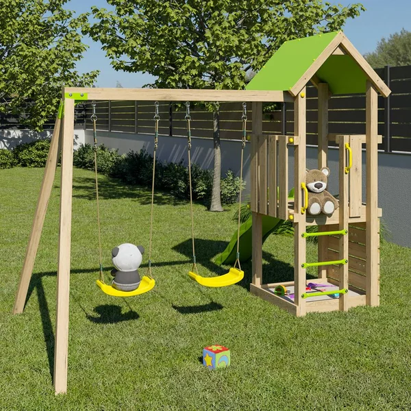 Aire de jeux en bois équipée de 1 plateforme hauteur 0.90 m avec garde-corps pour une protection renforcée, toit en bâche PVC traitée anti-UV coloris vert et 3 échelons métal coloris vert pour y accéder, 1 toboggan 1.73 m de glisse coloris vert, 1 bac à sable 80 x 60 cm, 1 mur de grimpe, 1 extension portique hauteur 1.90 m avec 2 balançoires soufflées réglables en hauteur coloris jaune. Pour enfant de 3 à 14 ans. Poids maximum 50 kg par agrès. Scellement impératif béton. Réservé à un usage familial. Destiné à une utilisation extérieure uniquement. Notice incluse.