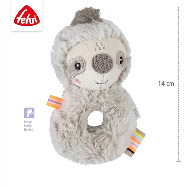 Le anneau en peluche qui crisse paresseux de la collection Lazy, Crazy & Pink stimule de manière ludique l’ouïe, le toucher et la prise de l’enfant.