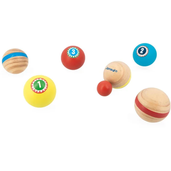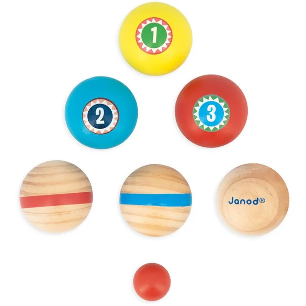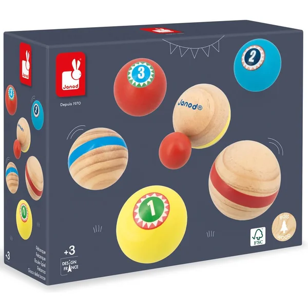 Tu pointes ou tu tires ? Premier jeu de pétanque léger, facile à utiliser par les plus petits. 6 boules (3 paires) et un cochonnet de couleurs attractives. Livré avec un sac de rangement en coton, très pratique pour emmener son jeu partout. Pour jouer en famille et entre amis. Encourage l’interaction sociale et développe la motricité fine. Jeu d’extérieur en bois FSCTM. Pour les enfants à partir de 3 ans. A partir de 2 joueurs
