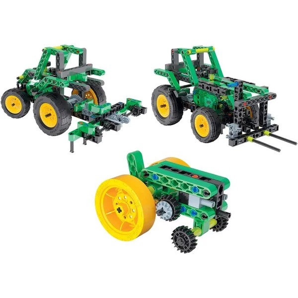 Construis des engins agricoles et découvre comment ils fonctionnent grâce aux systèmes de transmission. Expérimente les transmissions, utilise des engrenages et des poulies et comprend comment utiliser les leviers pour soulever des charges lourdes. Contient de nombreux composants : engrenages, poulies, différentiel, pneus avec jantes, taquets, etc. 10 modèles à assembler.