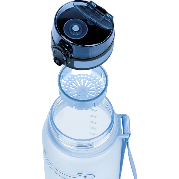 Le bouchon verrouillable ne laisse passer aucune goutte de boisson et assure une manipulation simple et intuitive. La bouteille est équipée d’un filtre, ce qui vous permet de l’utiliser pour des limonades avec des fruits ou du thé (le matériau est également adapté aux boissons chaudes). Un cordon est attaché à la bouteille, ce qui permet de la porter confortablement à la main.