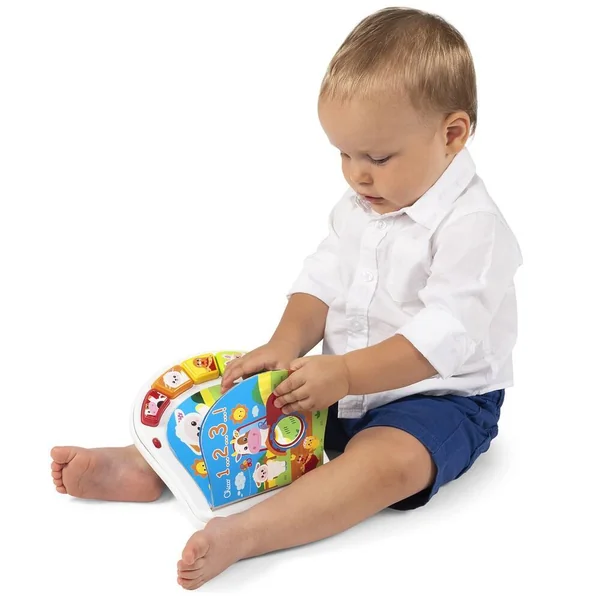 Nouveau concept de livre, plastique et papier. Base en plastique avec électronique et pages de papier. Apprendre les formes et les sons des animaux n’a jamais été aussi facile. Grâce aux cercles découpés dans ses pages, le livre-jeu Fattoria dei Numeri de Chicco est facile à feuilleter, même pour les plus petits. Chaque animal trouvé dans ses pages correspond à un bouton que l’enfant peut presser pour écouter le son. Aide l’enfant à apprendre : animaux et sons, chiffres et formes. Bouton ON/OFF.