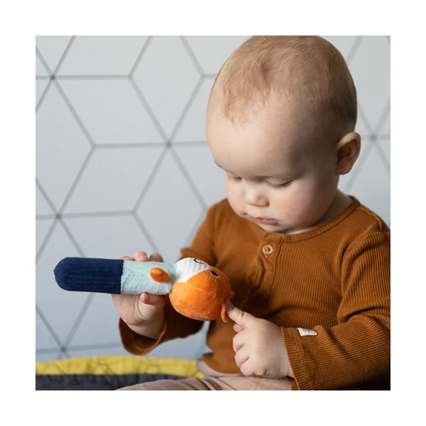 L’élément siffleur avec hochet est un jouet qui émet un son, nécessitant que le bébé s’engage et soit actif. Lorsqu’il le presse, il peut entendre un son agréable – c’est grâce à la sifflet caché à l’intérieur. C’est un excellent entraînement et une incitation à s’amuser.