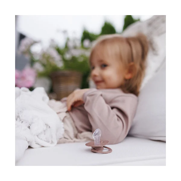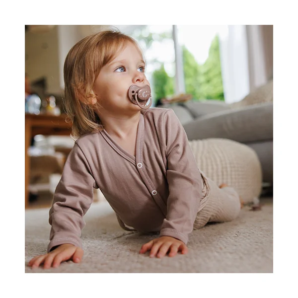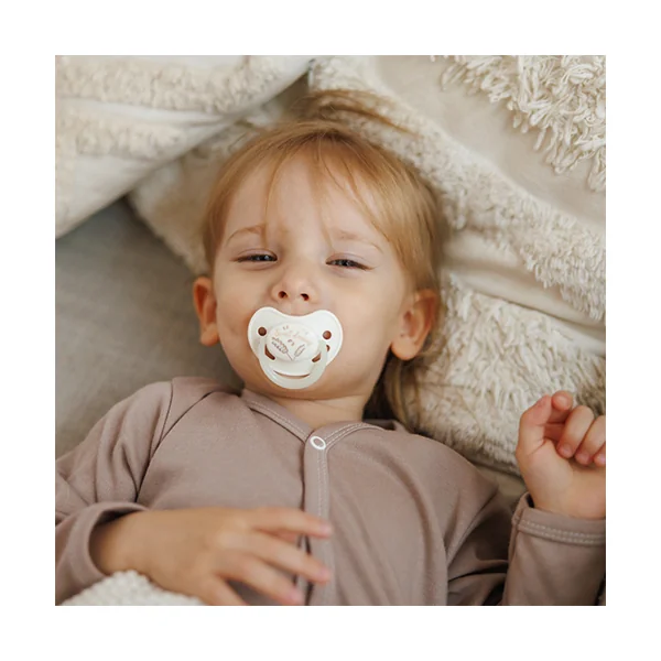 Important : Avant la première et chaque utilisation ultérieure, nettoyez et stérilisez soigneusement la tétine, par exemple en la faisant bouillir pendant 5 minutes dans de l’eau bouillante. Ne laissez pas le produit dans des solutions désinfectantes plus longtemps que recommandé. Ne jamais attacher de cordons ou de rubans non certifiés à la tétine (risque d’étouffement). Avant chaque utilisation, vérifiez l’état de la tétine – si elle est endommagée ou déformée, remplacez-la immédiatement. Remplacement recommandé tous les 1 à 2 mois pour des raisons d’hygiène. Ne jamais tremper la tétine dans des édulcorants ou des médicaments – cela peut provoquer des caries dentaires. Si la tétine se retrouve entièrement dans la bouche de l’enfant, ne paniquez pas – il est impossible de l’avaler, grâce aux ouvertures dans le bouclier, l’enfant peut respirer. Conservez dans un endroit sec à température ambiante, à l’abri de la lumière directe du soleil et des sources de chaleur.