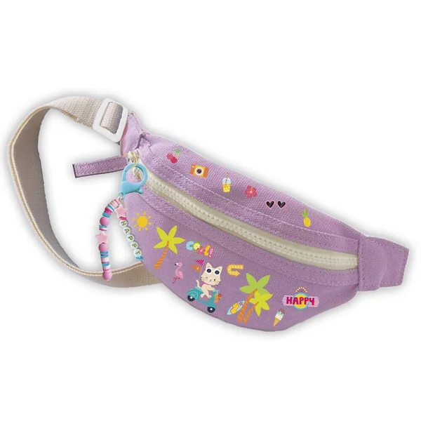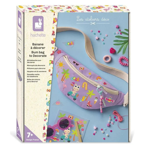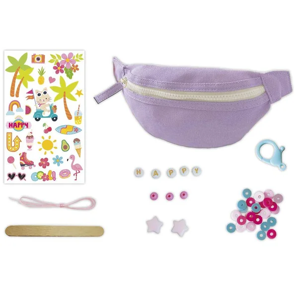 Personnalise ton sac banane ! Ce kit créatif permet de décorer une banane à l’aide de décalcomanies (résultat réussi garanti!) et aussi de réaliser un porte-clé à accorcher au zip. Il contient 1 sac banane uni mauve (21 x 12 cm) avec bandoulière et zip en couleur (100 % coton OEKOTEX), 1 planche de décalcomanies (11 x 18 cm), 1 outil en bois, des perles lettres, perles heishis, perles cœur et étoile, 1 mousqueton et 1 livret avec les instructions et les modèles?. Cette activité permet de développer sa créativité et sa patience et dure environ 40 minutes.