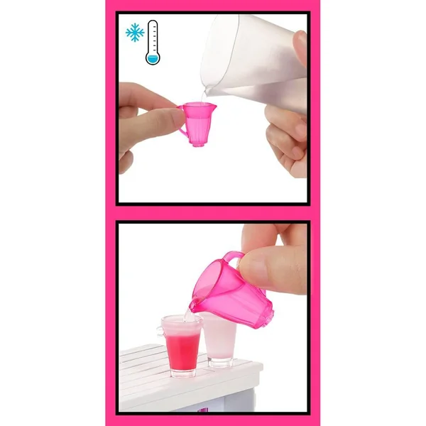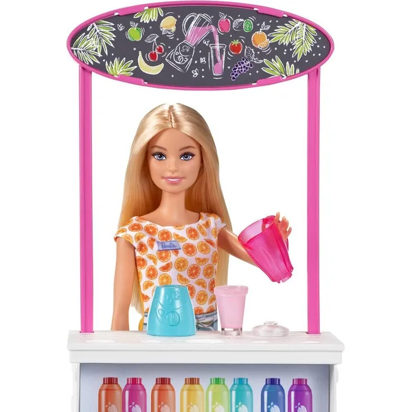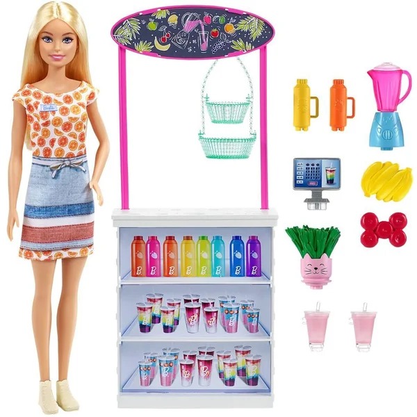 Avec ce coffret Barbie Bar à Smoothies, préparer et servir des boissons devient un jeu d’enfant ! La poupée Barbie dispose de tout le nécessaire pour préparer de succulents smoothies. Inclut une poupée Barbie, un stand de smoothies et 10 accessoires : 2 gobelets qui changent de couleur selon la température de l’eau qu’on y verse, avec couvercles amovibles, 2 gourdes, 2 ensembles de fruits, une corbeille à fruits, un blender, une caisse enregistreuse et un pot d’herbe de blé en forme de chat.
