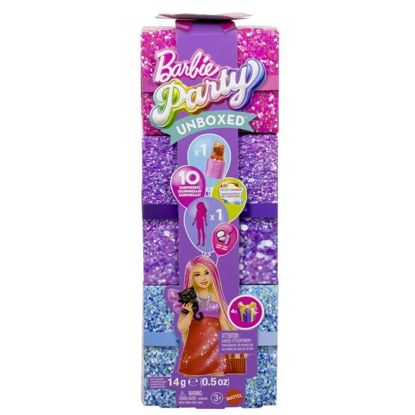 - Continuez à découvrir les ‘cadeaux’ mystères pour révéler les autres surprises cachées dans un coffret. Appuyez sur chaque section avec la brosse à maquillage incluse pour découvrir les accessoires de mode de la poupée Barbie !