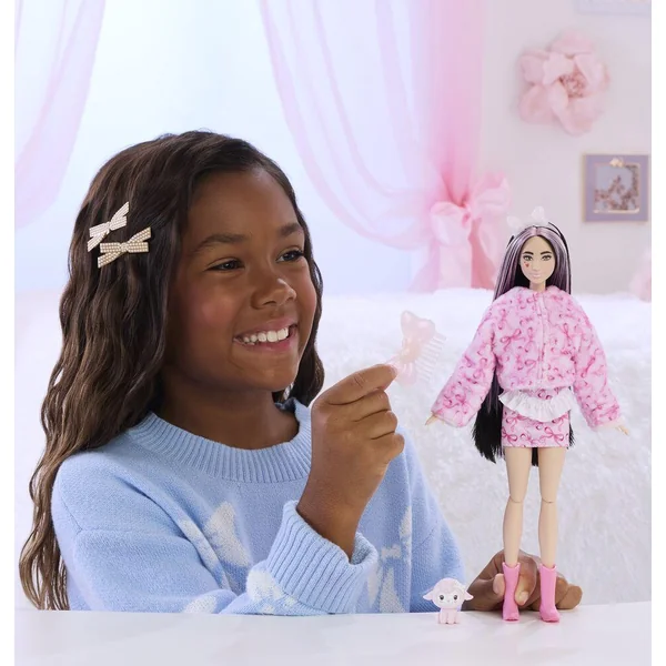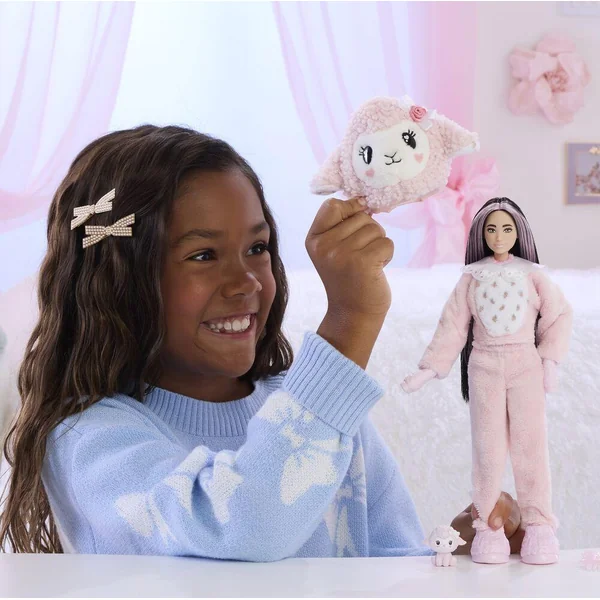 10 surprises sont à découvrir ! 1 Barbie articulée, 1 changement de couleur, 1 déguisement tout doux de mouton, 1 jupette, 1 agneau et des accessoires.