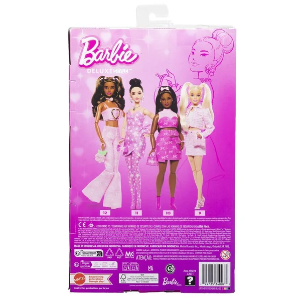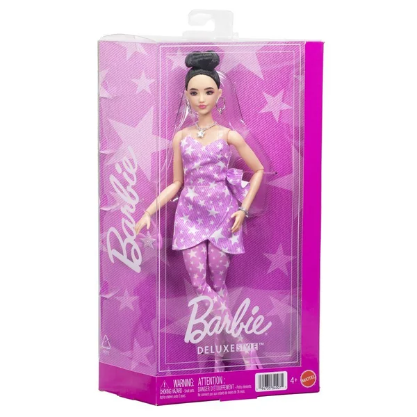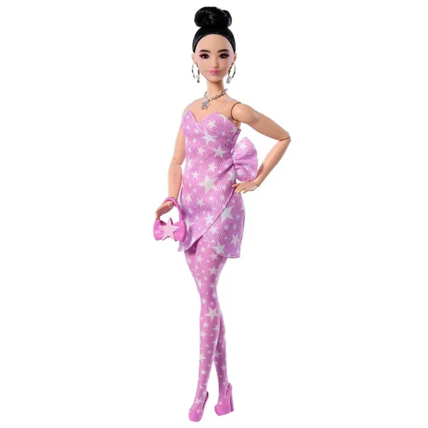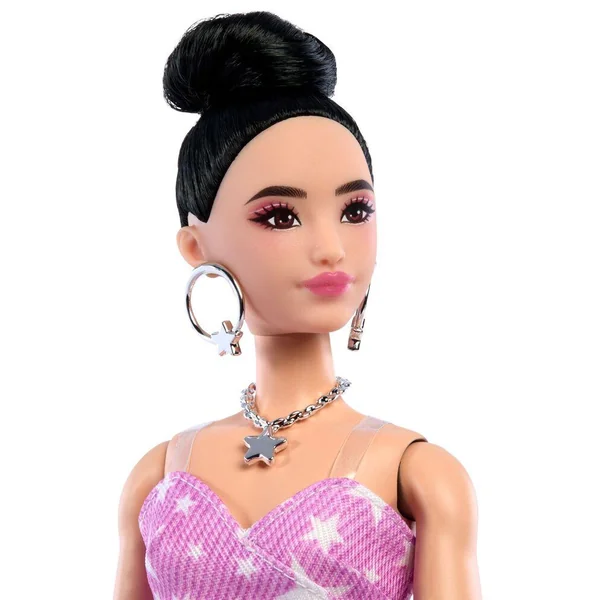Barbie a choisi un combi pantalon avec bustier rose pâle pour l’accorder à ses accessoires. Ses couettes et son teint hâlé la rendent très élégante.