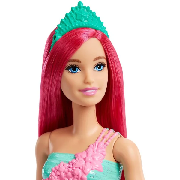 Cette princesse Barbie possède un bustier coloré avec des incrustations, un long jupon aux imprimés floraux, de longs cheveux ornés d’un diadème.