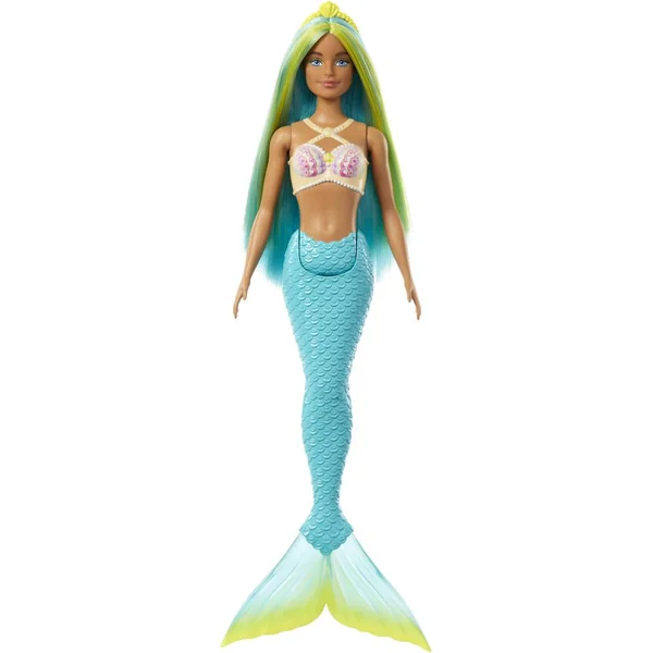 Poupée Barbie sirène avec des cheveux bleus et jaunes, une nageoir turquoise et un bandeau.