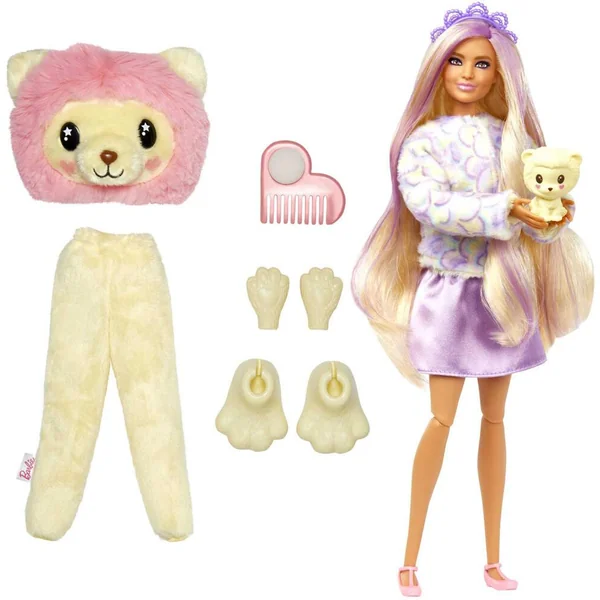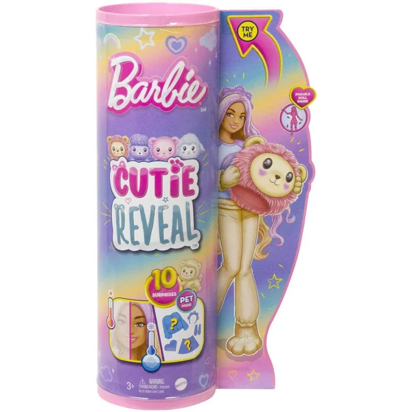10 surprises sont à découvrir dans le coffret ! 1 Barbie, 2 changements de couleur, 1 déguisement de lion avec 1 t-shirt, 1 figurine et des accessoires.