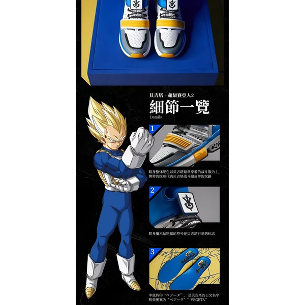 Ces baskets capturent l’essence même de Vegeta Super Saiyan. Le bleu dominant rappelle sa tenue de combat emblématique, symbole de sa détermination sans faille. Les touches de jaune, présentes avec énergie, évoquent l’aura puissante qui l’entoure lorsqu’il dépasse ses limites. Les lignes acérées et la structure robuste des baskets reflètent la puissance brute et la maîtrise martiale du prince Saiyan. Imaginez la vitesse fulgurante de ses attaques, la force de ses coups de poing : ces baskets sont une représentation tangible de cette énergie déchaînée. Chaque élément a été pensé pour rendre hommage à ce personnage complexe et charismatique, de la texture des matériaux à la disposition des couleurs. Portez l’héritage d’un guerrier légendaire à chaque pas, affichant votre propre force intérieure avec une élégance combative.