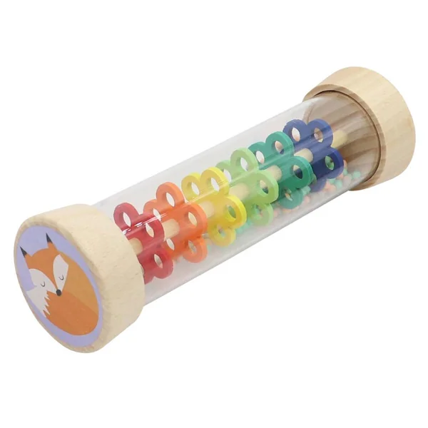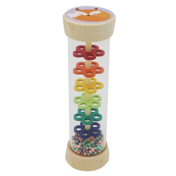 Bâton de pluie avec un renard à une extrémité et un chat à l’autre. C’est à ça que ressemble la pluie ! Avec ce bâton de pluie, vous pouvez imiter les doux sons de pluie. Il peut être utilisé de plusieurs façons comme hochet, instrument de rythme, jouet sonore ou jeu sensoriel calmant et ne fascine pas seulement les enfants. Le tube en plastique transparent du bâton de pluie permet de voir clairement les perles qui s’écoulent à travers les six plaques perforées de couleur en forme de fleurs. L’acoustique et la perception visuelle sont ainsi entraînées. Perles colorées en plastique. En bois certifié.