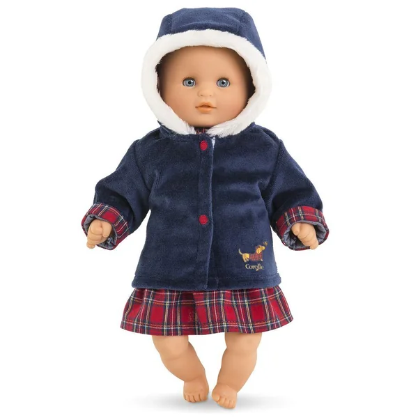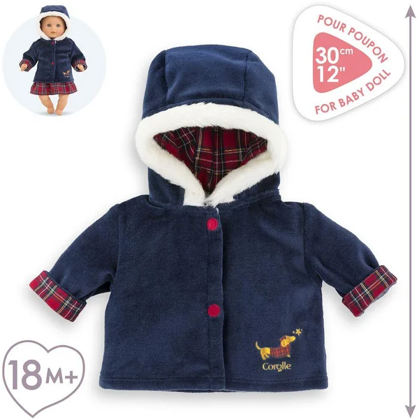 Brrr ! C’est l’hiver, il fait froid… Le Manteau Corolle en Fêtes est le vêtement d’extérieur indispensable pour les petits poupons de 30 cm. Ce manteau en velours bleu marine est tout doux et garde le poupon bien au chaud. Il a une jolie doublure en tissu écossais rouge et bleu marine à l’intérieur de la capuche. De jolies finitions sont aussi apportées autour de la capuche (fausse fourrure blanche) et des manches (revers en tissu écossais).
