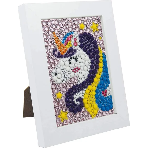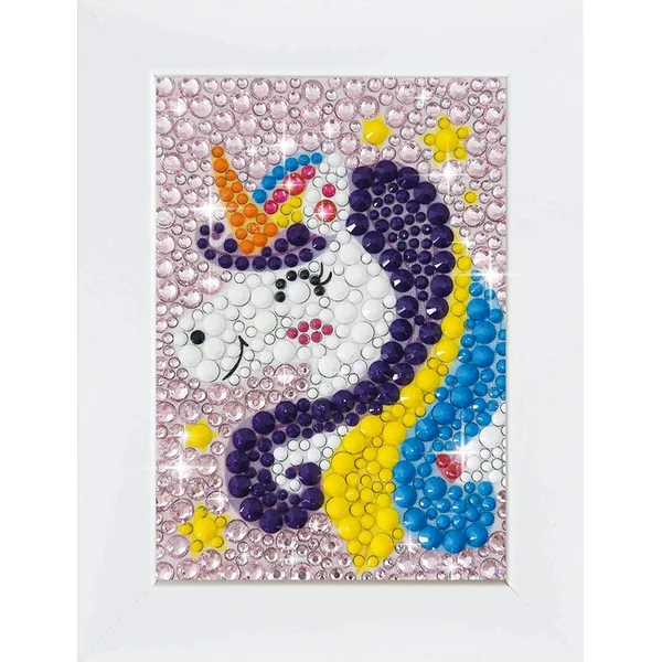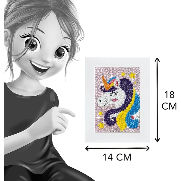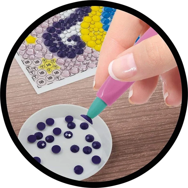 L’ensemble GLITTERS contient une image avec une couche autocollante et un gabarit avec des lettres et des chiffres, chaque lettre/chiffre représentant une certaine couleur et taille de cristal. À l’aide de l’outil, les cristaux sont ensuite placés sur le gabarit. L’image résultante est insérée dans un cadre et constitue une belle décoration.