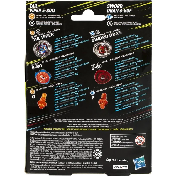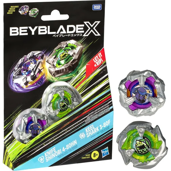 On peut vivre le frisson de la prochaine génération d’arènes, de lanceurs et de toupies Beyblade avec les Dual Packs Beyblade X qui incluent 2 toupies pour agrandir sa collection (arène Beystadium et lanceurs requis, vendus séparément). On peut se lancer directement dans la compétition ou reconfigurer la toupie de ce Dual Pack en interchangeant les pièces avec celles d’autres toupies Beyblade X (vendues séparément) pour créer sa propre toupie imbattable. Beyblade X utilise le tout nouveau système Propulsion X pour faire passer l’action au niveau supérieur. Quand les dents du pignon d’une toupie Beyblade X rencontrent celles du rail de l’arène Beystadium, elle reçoit une super accélération qui la propulse à toute vitesse dans l’arène pour des impacts écrasants et des explosions spectaculaires. Les Bladers lancent leurs toupies dans des compétitions intenses contre leurs adversaires et marquent des points à chaque affrontement. Le premier à marquer 4 points gagne. Les toupies Hasbro Beyblade avec pièces en métal moulé Takara Tomy authentiques sont de super cadeaux pour filles et garçons à partir de 8 ans. HASBRO et tous les logos et marques associés sont des marques de commerce de Hasbro, Inc.