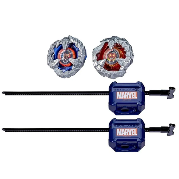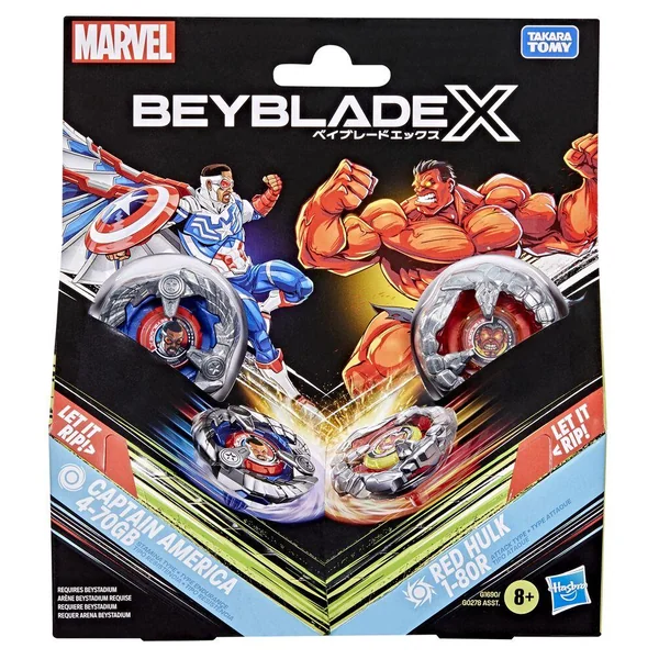 On peut vivre l’expérience Beyblade X, la prochaine génération d’arènes, de lanceurs et de toupies Beyblade. Le multipack Collaboration Beyblade X et Marvel Captain America 4-70GB contre Red Hulk 1-80R inclut 2 toupies à rotation droite et 2 lanceurs (arène Beystadium requise, vendue séparément). On peut se lancer directement dans la compétition ou reconfigurer la toupie de ce multipack Marvel Collab en interchangeant les pièces avec celles d’autres toupies Beyblade X (vendues séparément) pour créer la toupie parfaite. Beyblade X utilise le tout nouveau système Accélération X pour faire passer l’action au niveau supérieur. Quand les dents du pignon d’une toupie Beyblade X rencontrent celles du rail de l’arène Beystadium, elle reçoit une super-accélération qui la propulse à toute vitesse dans l’arène Les Bladers lancent leurs toupies dans des compétitions intenses contre leurs adversaires et marquent des points. Le premier à marquer 4 points gagne.
