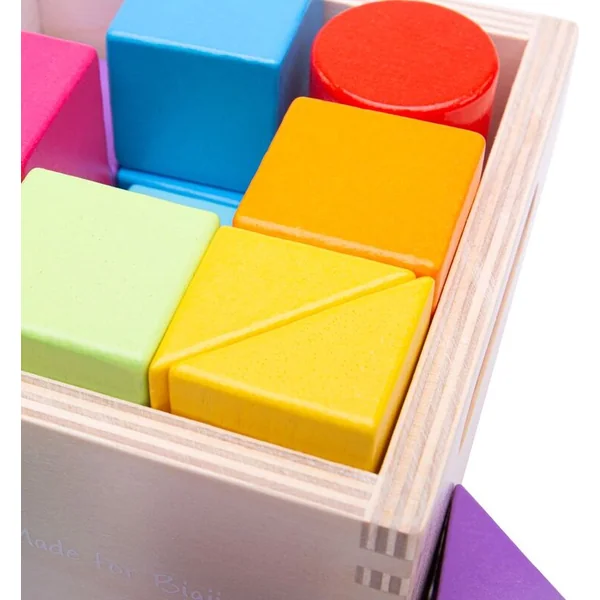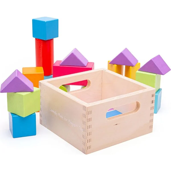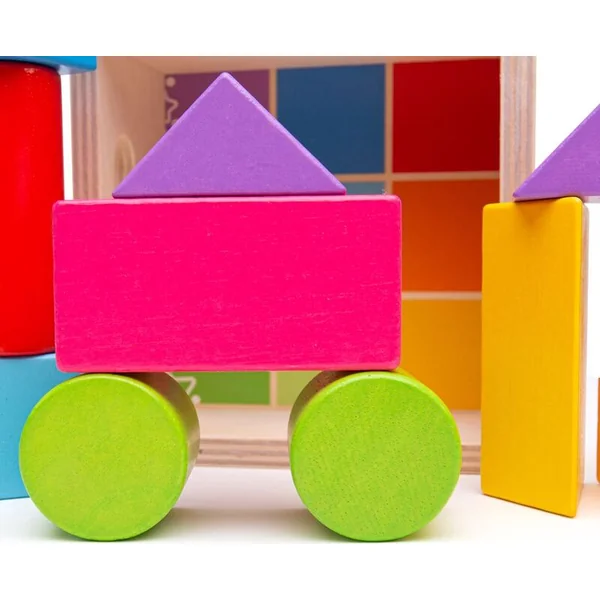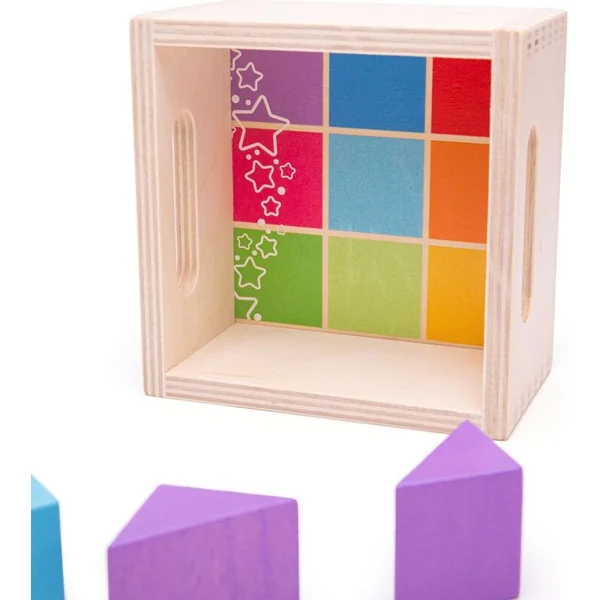 Une introduction classique au monde des formes et des couleurs. Une belle boîte pleine de cubes colorés de différentes formes. Sur les côtés de la boîte, il y a des ouvertures pour faciliter le transport. Cela aide au développement des compétences et de la coordination main-œil, ainsi qu’à l’imagination spatiale.