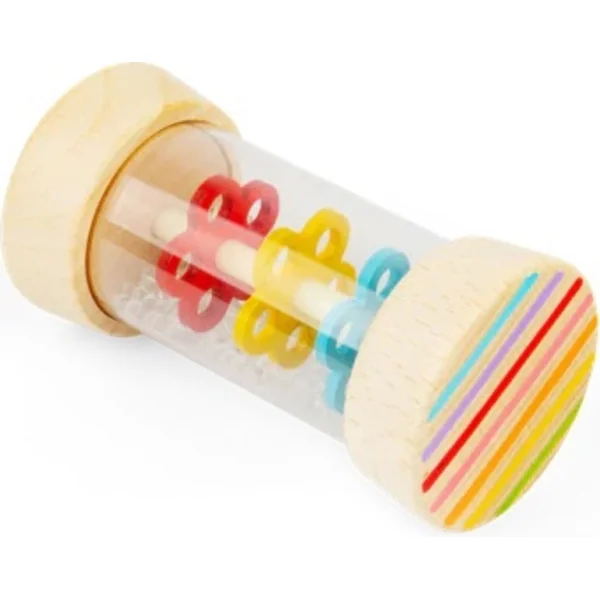 Voilà comment sonne la pluie ! Avec la canne à pluie, vous pouvez imiter les sons de la douce pluie. Vous pouvez l’utiliser comme hochet, jouet rythmique. Le corps du jouet est transparent, vous pouvez ainsi observer comment les billes se déplacent à travers les barrières en forme de fleurs.