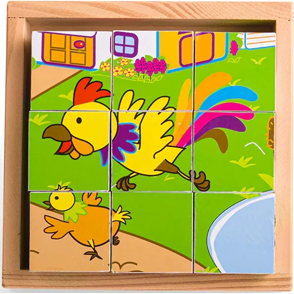 Neuf cubes en bois créent six images différentes. Tournez chaque cube et créez une image, ou mélangez-les pour vous amuser !