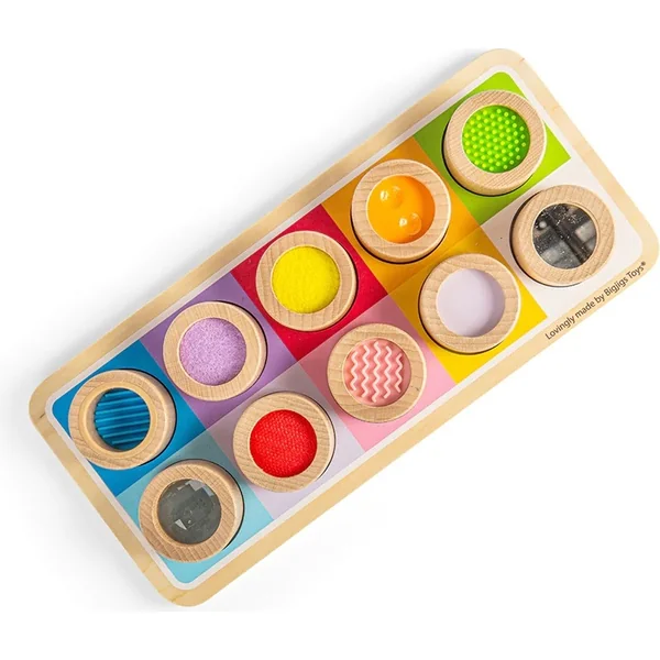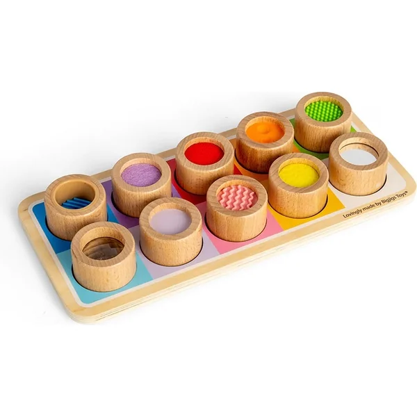 Les enfants découvrent de nouveaux motifs et textures avec ce tableau sensoriel en bois. Le jouet se compose d’une planche en bois avec des trous colorés et de dix pièces cylindriques, que vous trouverez par exemple en silicone strié, en feutre, en miroir… Ce tableau sensoriel apprend aux enfants à faire la différence entre différentes textures, tailles et couleurs. Les enfants exercent leur habileté et leur motricité en jouant.