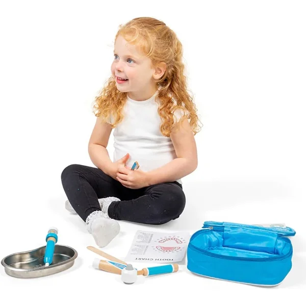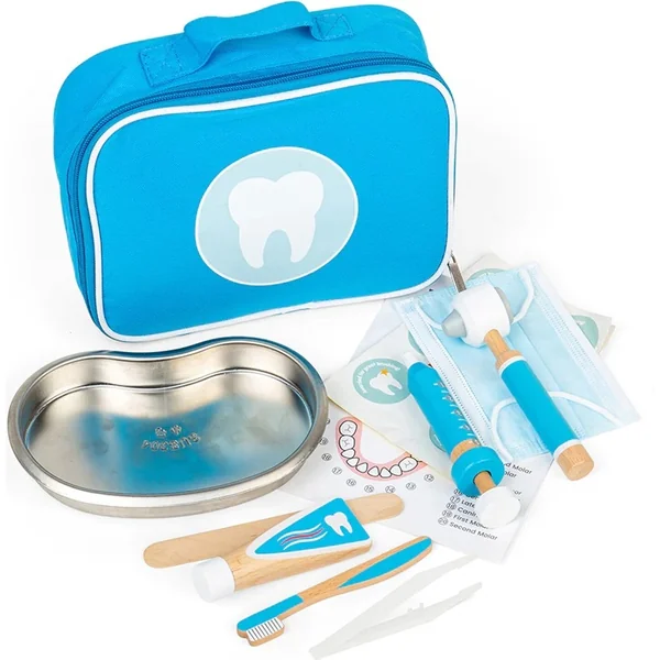 Ce set d’outils amusant pour dentistes est livré dans une mallette médicale bleue. Avec des outils réalistes, tels qu’une brosse à dents en bois, un tube de dentifrice, une seringue, un otoscope, une pince à épiler, des masques médicaux, un plateau en acier inoxydable, un autocollant et des instructions pour un bon nettoyage des dents.
