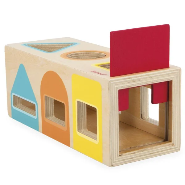 Cette jolie boite astucieuse est idéale pour commencer l’apprentissage des couleurs et des formes géométriques (triangle, rond, carré) que votre enfant doit faire rentrer dans la boite à travers la bonne fente. Elle permet également d’appréhender la notion d’épaisseur grâce à ses 3 côtés où votre enfant doit insérer les pièces sous des angles différents. La boite comprend 6 pièces de couleurs (2 triangles, 2 ronds et 2 carrés) qui se rangent dans la boite. Une petite trappe coulissante permet de l’ouvrir afin de récupérer les pièces facilement. Bois : contreplaqué pour la boite et hêtre pour les pièces géométriques.