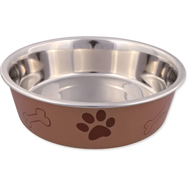 Bol en acier inoxydable pour chiens avec une surface en plastique.