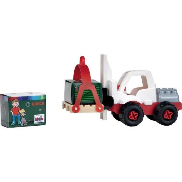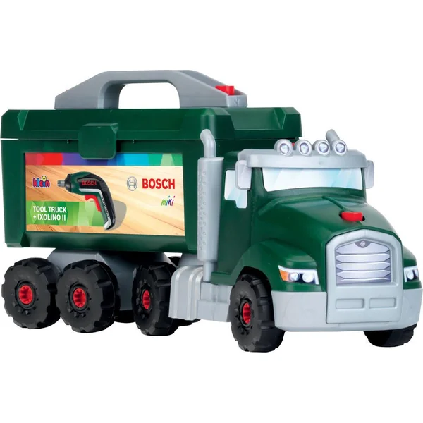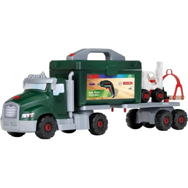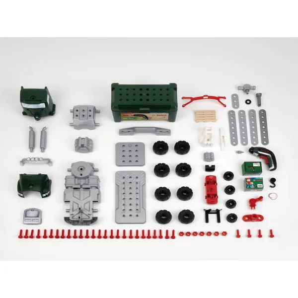 À l’aide de ta visseuse à effets sonores et lumineux, construis l’avant du camion, la remorque, la grue et le chariot élévateur avec palette ! La caisse à outils peut être fixée sur le camion.