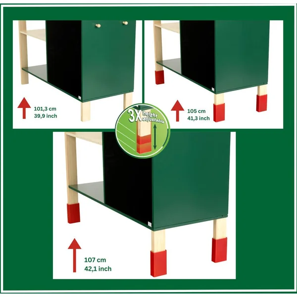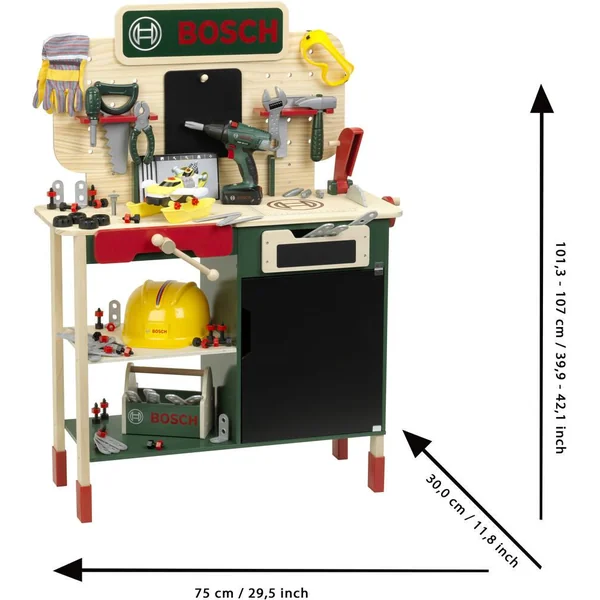 D’une qualité exceptionnelle, il séduit aussi parce qu’il est très bien équipé avec 1 large plan de travail pour un grand confort de jeu, 1 panneau vertical avec deux petites étagères pour suspendre ou poser des outils et un crochet pour suspendre l’ardoise, 1 étau, 1 scie circulaire avec bruitage mécanique, manivelle et protection, 1 tiroir avec une partie en ardoise, 1 compartiment de rangement avec porte en ardoise, 2 étagères de rangement.