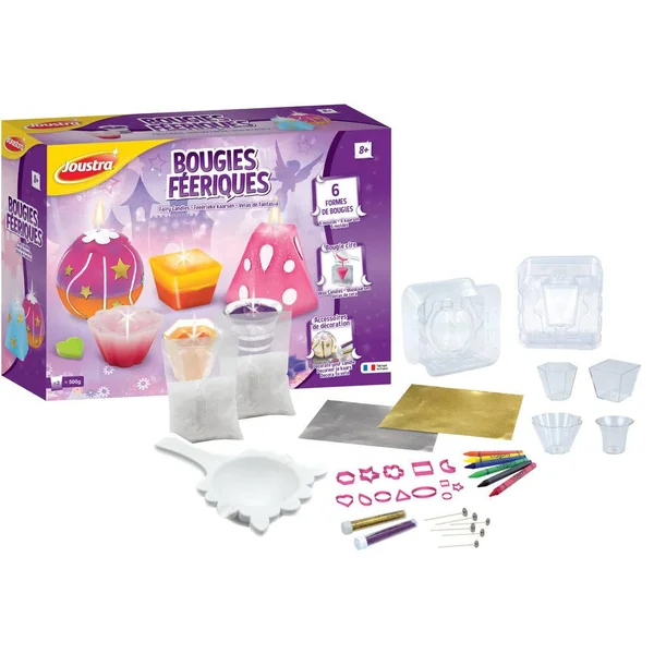 Création de bougies de cire, originales et féériques. Contenu très riche comprenant des photophores, 6 mèches, et différentes formes de bougies : rondes, carrées, rectangulaires.
