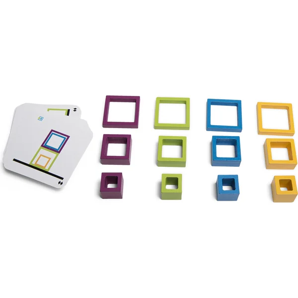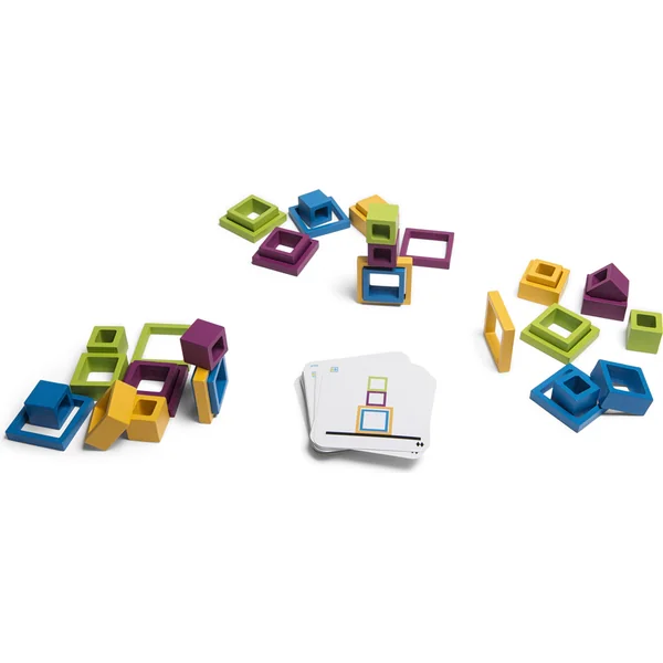 Les joueurs retournent une carte avec un motif et essaient de reproduire l’image le plus rapidement possible à l’aide des cadres. Qui est le meilleur et le plus rapide constructeur ?