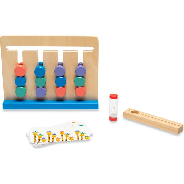 Jeu d’observation et de logique pour 1 joueur à partir de 4 ans. Choisissez une carte et maintenant déplacez les pièces rondes colorées dans le même ordre que celui que vous voyez sur le modèle. Ça se passe bien ? Alors essayez de faire la même chose avec un chronomètre.