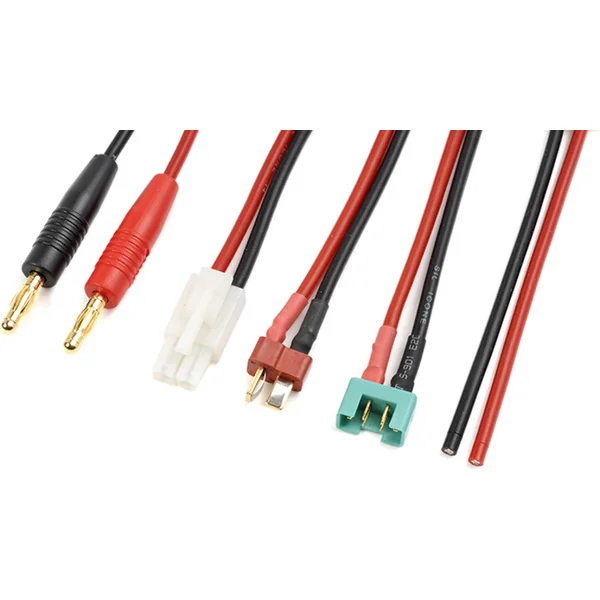 Câble de charge avec bananes de 4 mm et connecteurs branchés en parallèle – Tamyia, Deans, MPX (appareil) et une paire de câbles libres. Le câble a une section de 16AWG.
