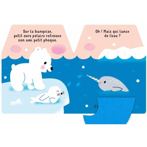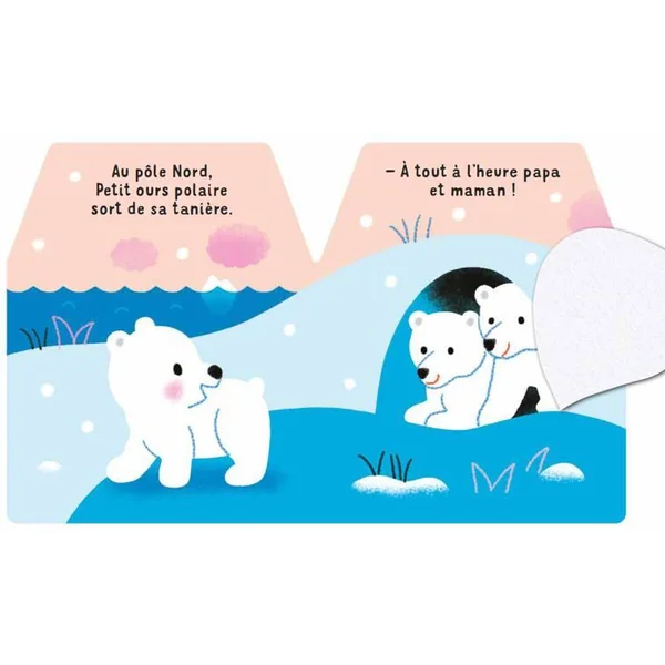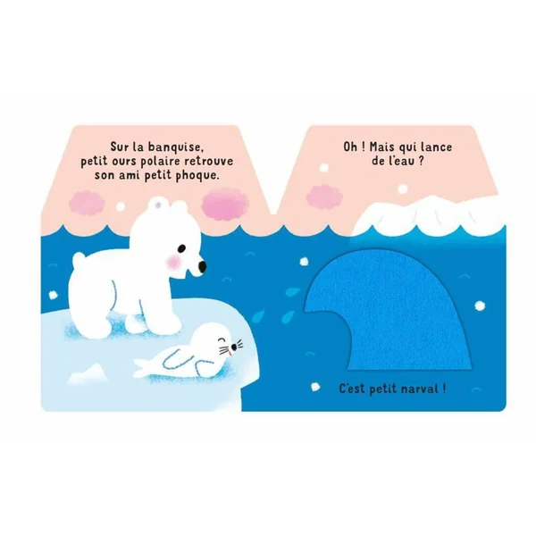 Le petit ours polaire arrive dans la collection incontournable des bébés !Petit ours polaire sort de sa tanière. Il retrouve son ami petit phoque.Qui leur lance de l’eau ? C’est petit narval.Et dans l’océan, qui frétille derrière le rocher ? Des poissons !Les amis arrivent à temps au sommet du glacier pour admirer les aurores boréales. Quel spectacle !Un livre matière pour les bébés dès 6 mois avec des flaps en feutrine à soulever pour encourager la motricité fine.