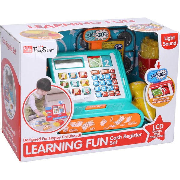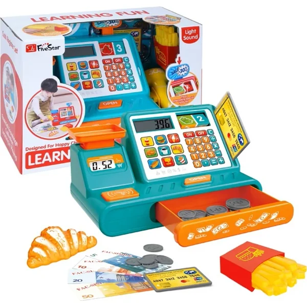 - une caisse avec un tiroir à pièces, un écran et une calculatrice fonctionnelle,