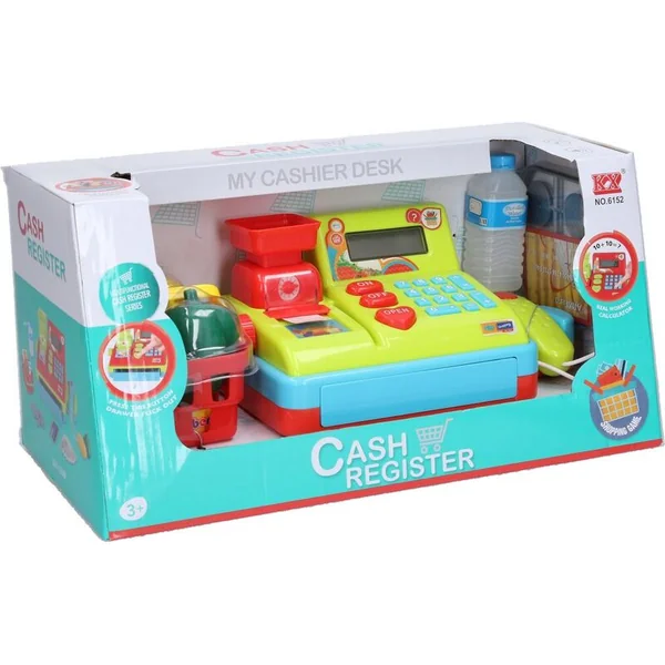 Contient une caisse avec une balance, un reçu en papier sortant, un tiroir coulissant, de l’argent et un panier avec des courses.