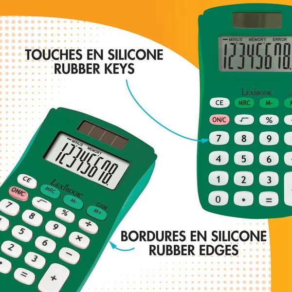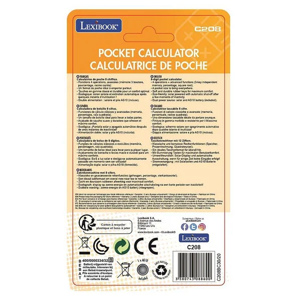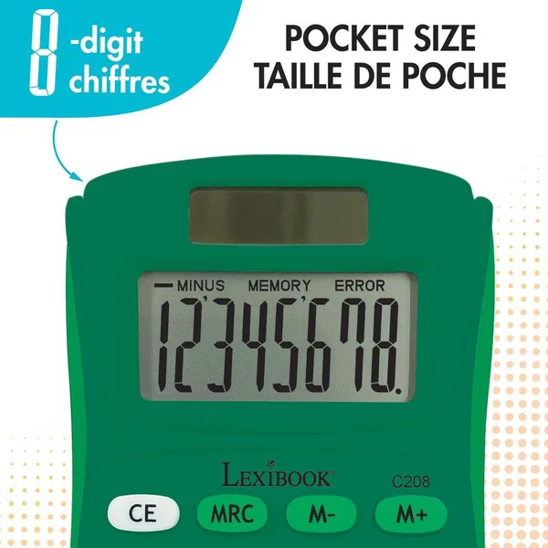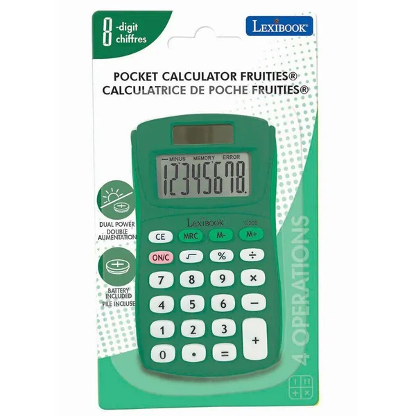 Calculatrice de poche 8 chiffres colorée.Fonctions 4 opérations, avancées (mémoire 3 boutons, pourcentage, racine carrée)Un format de poche idéal à emporter partout.Touches en gomme douce et durable pour un confort optimal.Écologique: écran solaire et extinction automatique après quelques instants d’inutilisation !Double alimentation : solaire et pile AG10 (incluse).