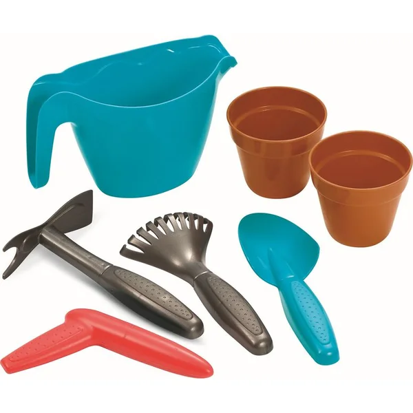Comprend un arrosoir, deux pots de fleurs, une pelle, un râteau, une bêche et un piquet de plantation.