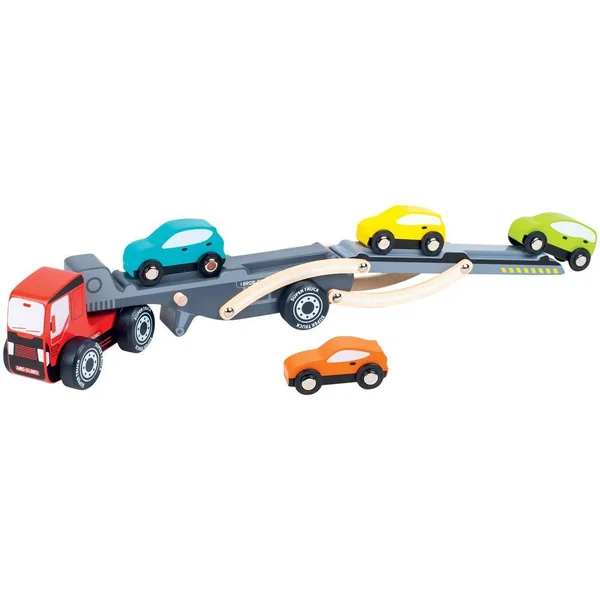 Camion de transport de véhicules en bois. Avec 4 voitures incluses de 7 cm de long. Camion de transport avec remorque détachable. En basculant manuellement le niveau supérieur de la remorque vers l’arrière, tu pourras charger ou décharger les voitures. Voitures : Compatible avec les sets de train et d’automobile en bois (vendus séparément). Développement de l’imaginaire. Facile à manipuler. Dimensions du camion de transport : 28,5 x 5.6 x hauteur 15 cm avec les voitures chargées (sans 12 cm). Longueur du camion ouvert 45 cm (niveau supérieur basculé).