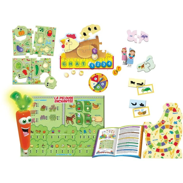 Les enfants disposent de la carotte parlante et lumineuse et d’un très grand nombre de pièces en carton très résistant qui représentent de gentils animaux, des aliments et des objets du monde agricole. De plus, des nombreuses pièces à la forme ovale représentant des lettres permettront d’apprendre à écrire et jouer grâce à des jeux de société amusants.
