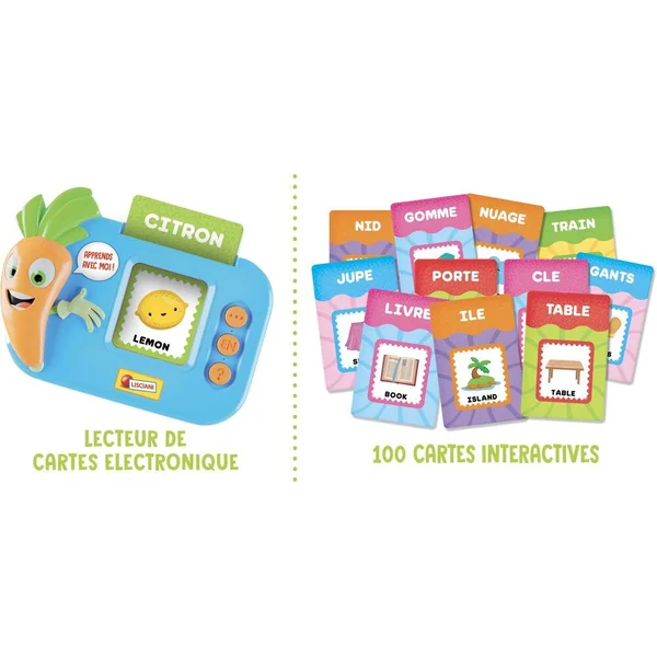 Un jeu interactif ludique pour découvrir plus de 100 mots en anglais et français. Il suffit d’insérer la carte et d’écouter. De plus, Carotina stimule ta logique avec son quiz amusant !