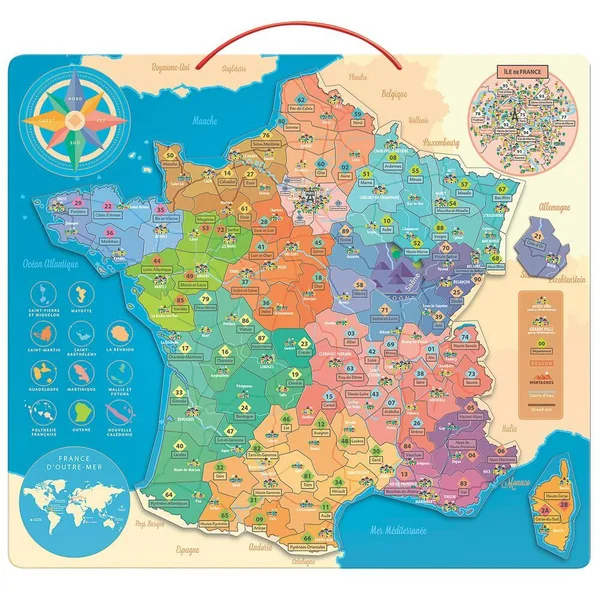 Partir à la découverte de la France, de ses nouvelles régions, de ses départements et de sa géographie tout en s’amusant. Cette carte de France est idéal pour aider l’enfant à se situer dans le pays. Comprend un plateau en bois de 92 magnets.