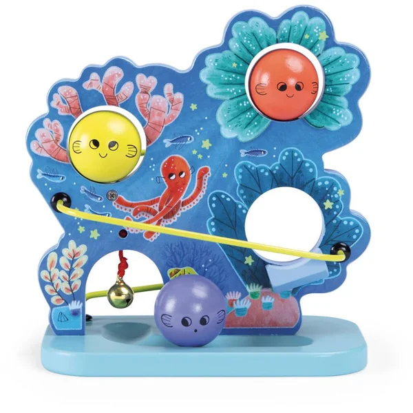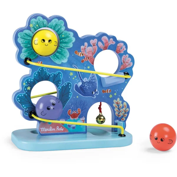 Bienvenue dans les fonds coralliens avec cette cascade en bois aux couleurs de l’océan ! Bébé va adorer faire dévaler les boules à l’effigie de petits poissons qui feront tinter la clochette à l’arrivée. Contient 3 boules.