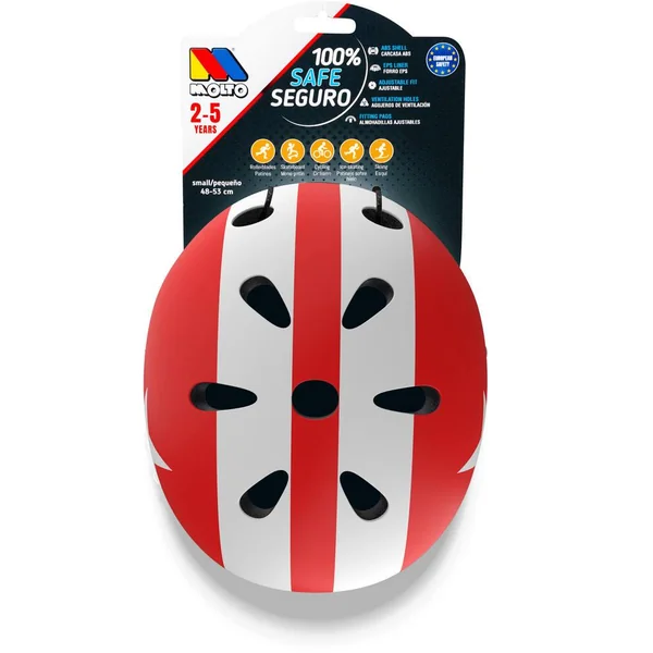 Casque pour enfant rouge Star. Pour les enfants de 2 à 5 ans. Taille S : 48 – 53 cm. Fabriqué en ABS avec doublure en mousse EPS, jugulaire réglable, système d’ajustement de la tête, entrées de ventilation et coussinets réglables. Ce casques est résistant aux chocs et peut donc être utilisé dans pratiquement toutes les activités sportives en toute sécurité : vélos, rollers, skateboard, patinage, ski.