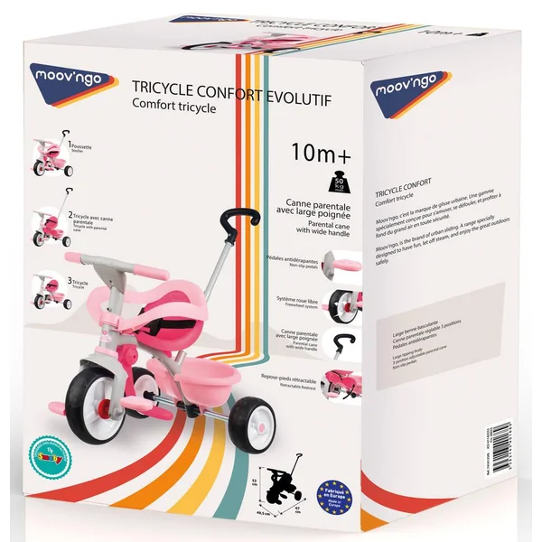 Tricycle 3 en 1, complet. Adapté pour les plus petits. Avec 3 évolutions possibles : 1) poussette (avec arceau de sécurité), 2) tricycle avec canne parentale et 3) tricycle. Cadre 100% métal. Siège enveloppant réglable sur 2 positions et équipé d’une ceinture de sécurité. Canne parentale avec large poignée : amovible et réglable sur 3 positions (hauteur maximum 100 cm). Pédales antidérapantes. Repose-pieds rétractable. Arceau de sécurité amovible. Système roue libre. Blocage de direction. Benne basculante. Roues en gomme silencieuses et anti-dérapantes. Conçu et fabriqué par Smoby. Tricycle évolutif accompagnant l’enfant de 10 mois à plus de 3 ans. Poids maximum de l’utilisateur : 50 kg. Notice de montage incluse. Fabrication espagnole. Coloris : CERISE & CAPUCINE.